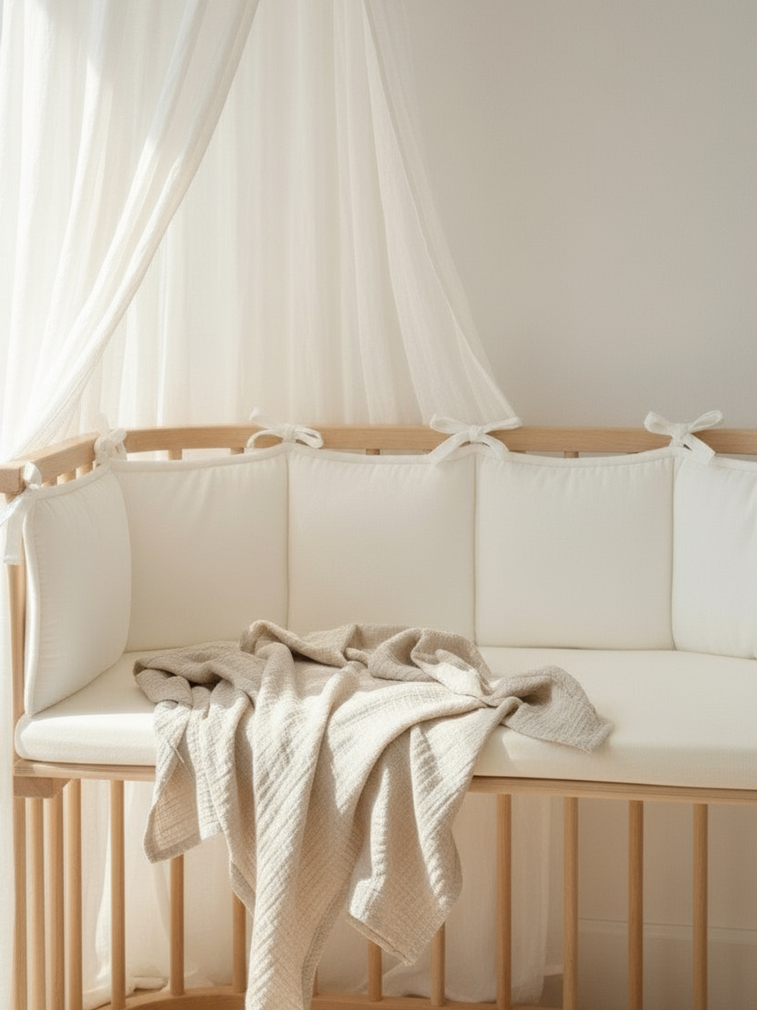Благодаря мягкому бортику из хлопка, малыш не ударится о рейки кроватки. Цельнокройный бортик не имеет дополнительных отверстий, что снижает вероятность застывания. Завязки надежно фиксируют бортик в кроватке малыша. Мы используем только оригинальный наполнитель Hollowphiber ®(cертифицирован по европейскому экологическому стандарту Oeko-Tex Standard 100 Class), поэтому уверены в безопасности его использования. Такой наполнитель обеспечивает циркуляцию воздуха, чтобы спальное место малыша было максимально комфортным.