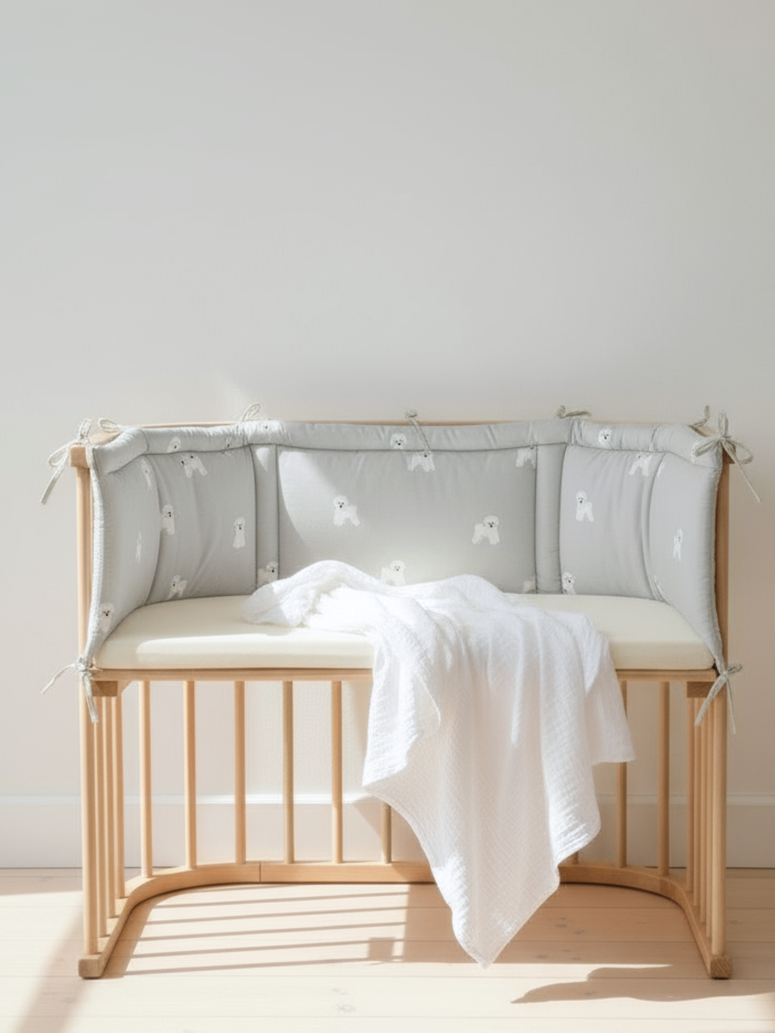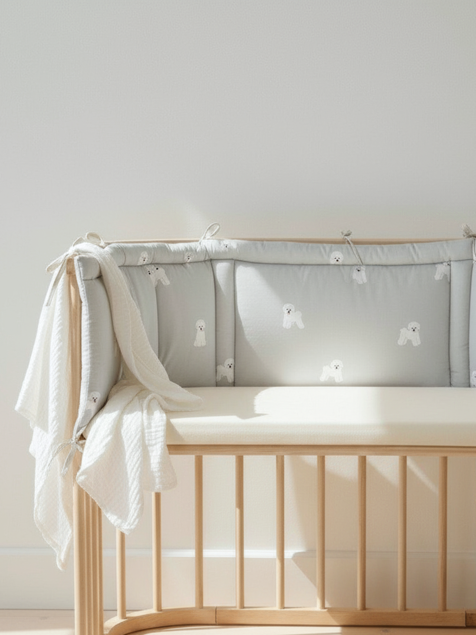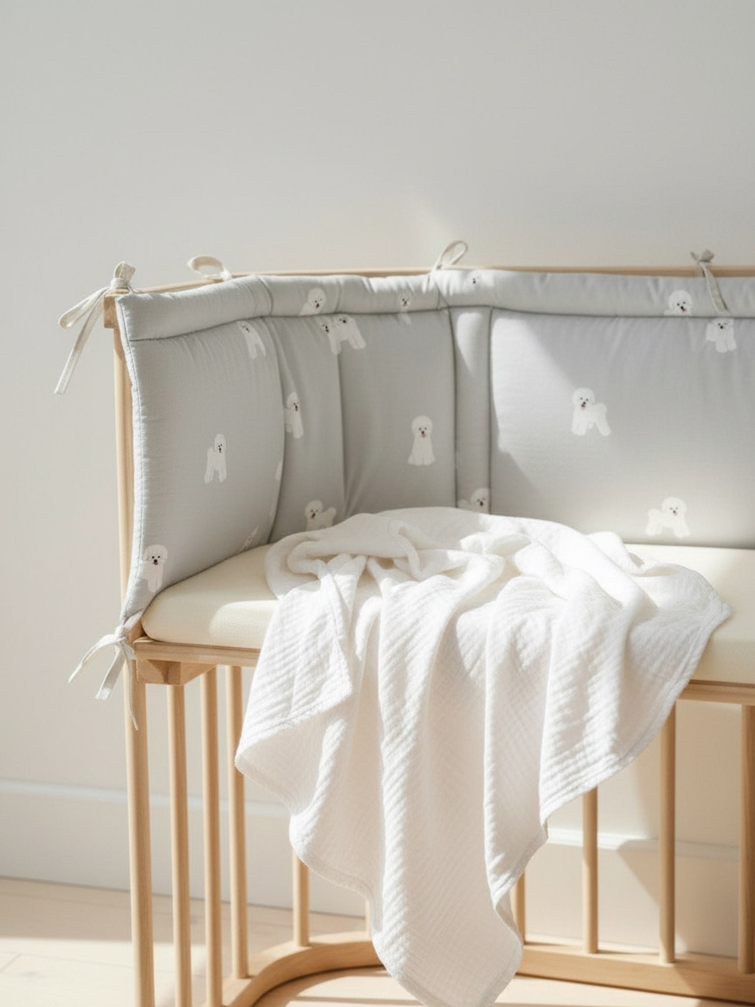 Благодаря мягкому бортику из льна и хлопка, малыш не ударится о рейки кроватки. Цельнокройный бортик не имеет дополнительных отверстий, что снижает вероятность застывания. Завязки надежно фиксируют бортик в кроватке малыша. Мы используем только оригинальный наполнитель Hollowphiber ®(cертифицирован по европейскому экологическому стандарту Oeko-Tex Standard 100 Class), поэтому уверены в безопасности его использования. Такой наполнитель обеспечивает циркуляцию воздуха, чтобы спальное место малыша было максимально комфортным.