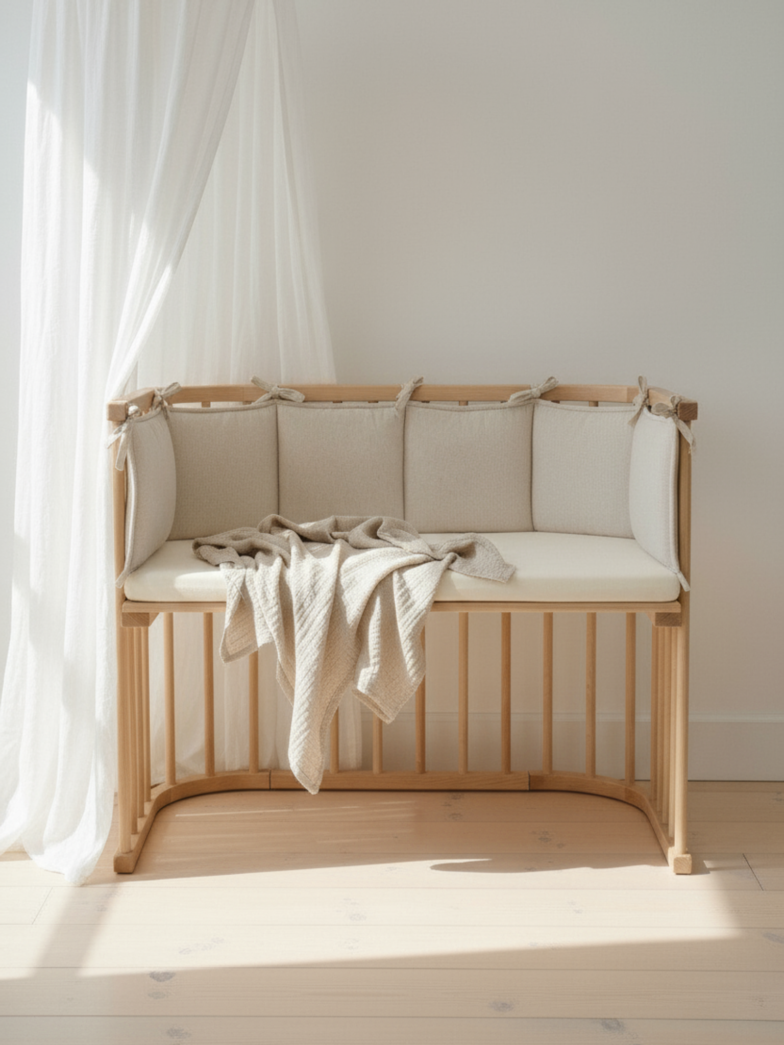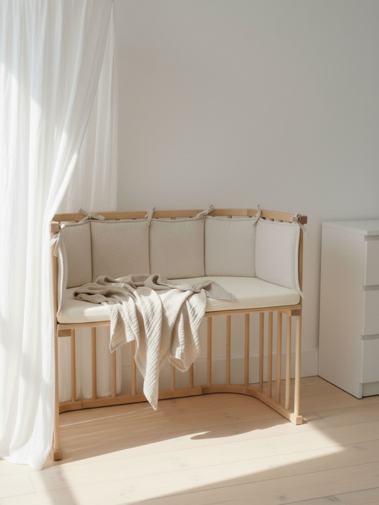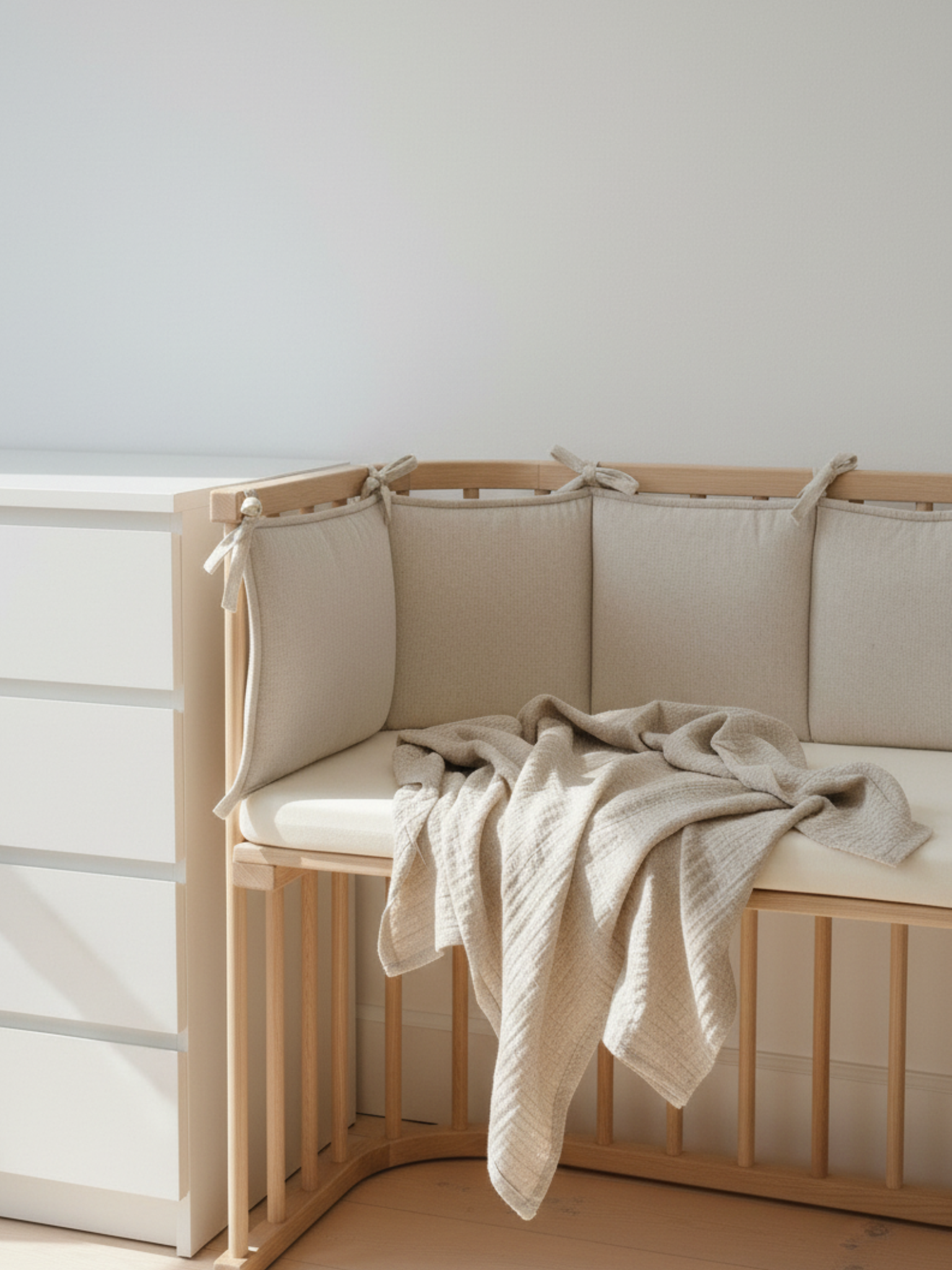 Благодаря мягкому бортику из льна и хлопка, малыш не ударится о рейки кроватки. Цельнокройный бортик не имеет дополнительных отверстий, что снижает вероятность застывания. Завязки надежно фиксируют бортик в кроватке малыша. Мы используем только оригинальный наполнитель Hollowphiber ®(cертифицирован по европейскому экологическому стандарту Oeko-Tex Standard 100 Class), поэтому уверены в безопасности его использования. Такой наполнитель обеспечивает циркуляцию воздуха, чтобы спальное место малыша было максимально комфортным.
