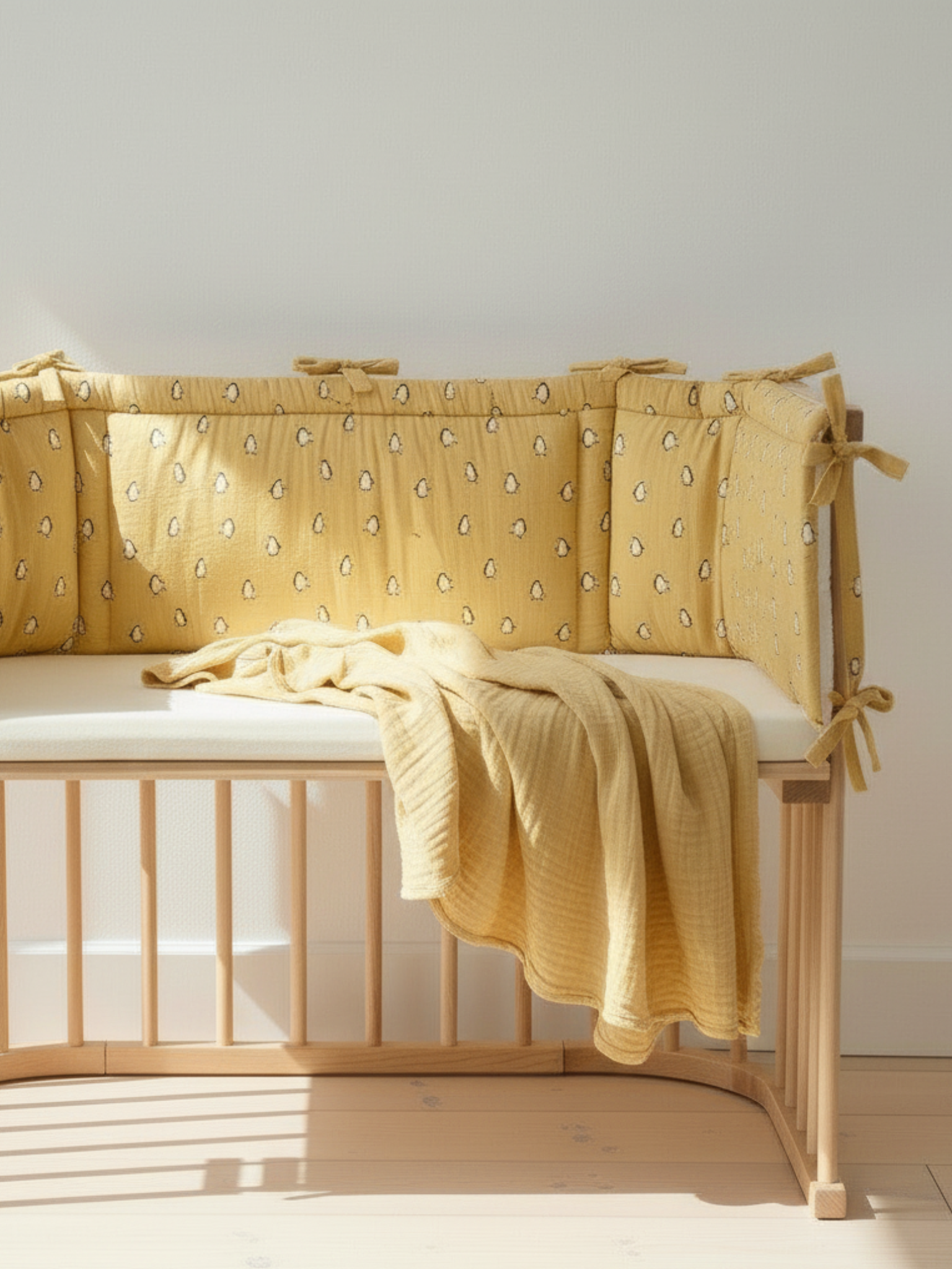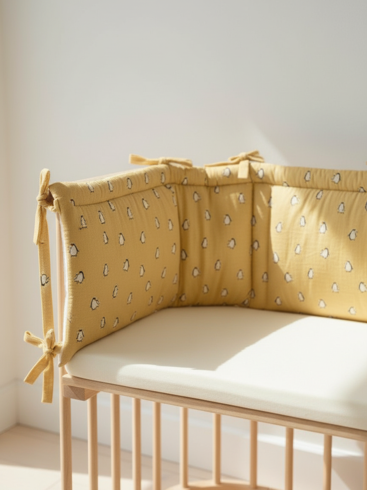 Благодаря мягкому бортику из льна и хлопка, малыш не ударится о рейки кроватки. Цельнокройный бортик не имеет дополнительных отверстий, что снижает вероятность застывания. Завязки надежно фиксируют бортик в кроватке малыша. Мы используем только оригинальный наполнитель Hollowphiber ®(cертифицирован по европейскому экологическому стандарту Oeko-Tex Standard 100 Class), поэтому уверены в безопасности его использования. Такой наполнитель обеспечивает циркуляцию воздуха, чтобы спальное место малыша было максимально комфортным.