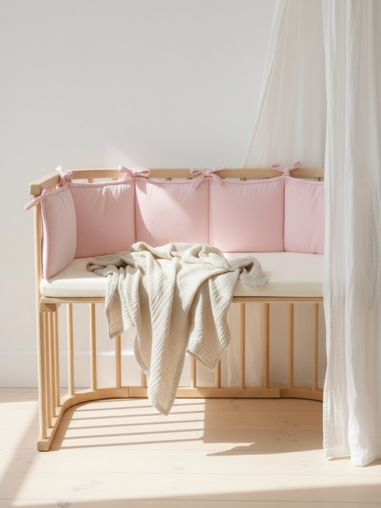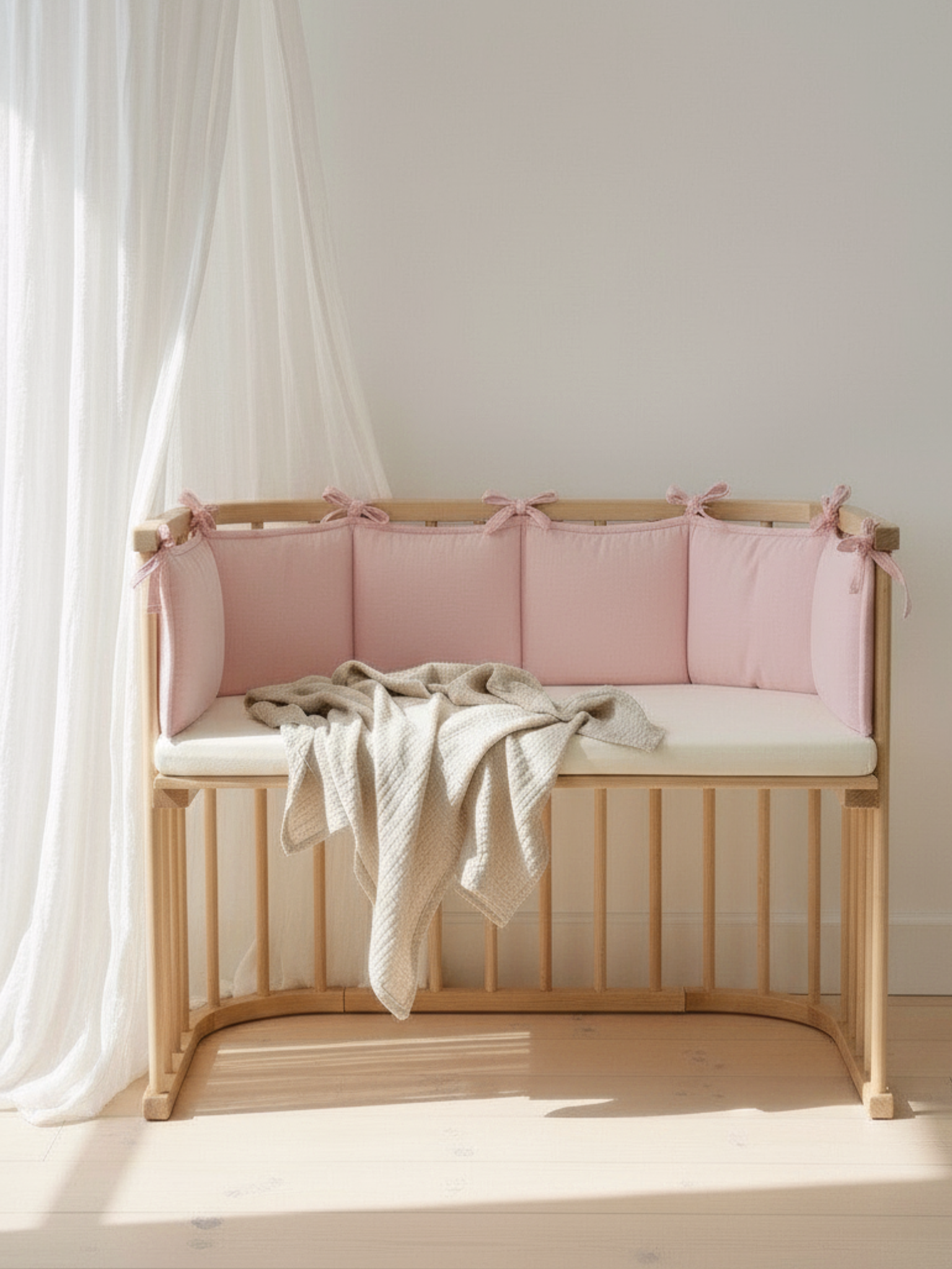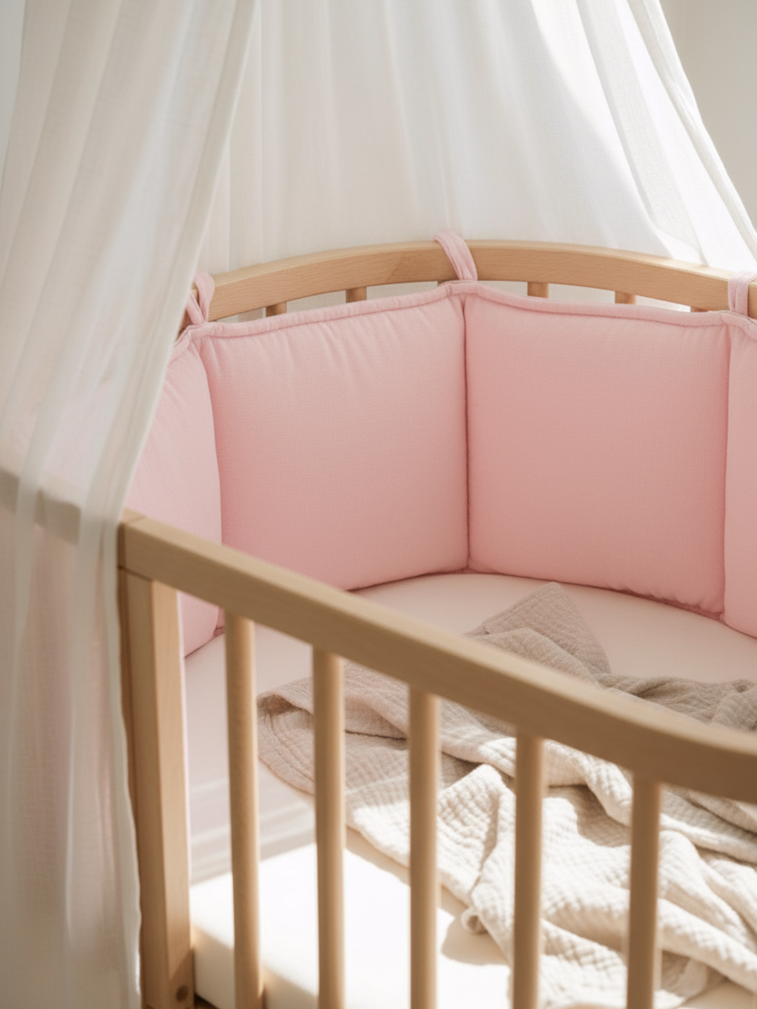 Благодаря мягкому бортику из хлопка, малыш не ударится о рейки кроватки. Цельнокройный бортик не имеет дополнительных отверстий, что снижает вероятность застывания. Завязки надежно фиксируют бортик в кроватке малыша. Мы используем только оригинальный наполнитель Hollowphiber ®(cертифицирован по европейскому экологическому стандарту Oeko-Tex Standard 100 Class), поэтому уверены в безопасности его использования. Такой наполнитель обеспечивает циркуляцию воздуха, чтобы спальное место малыша было максимально комфортным.