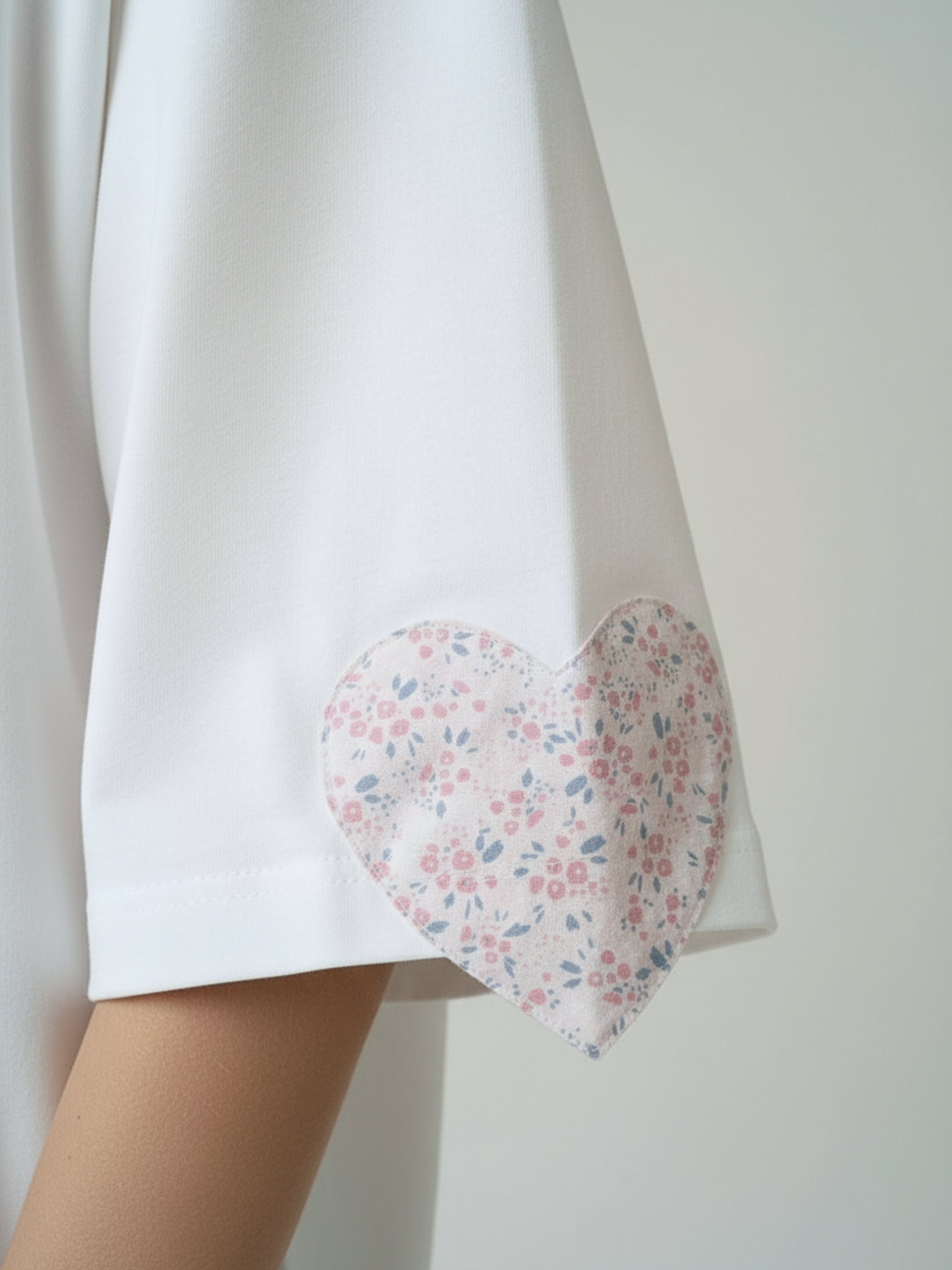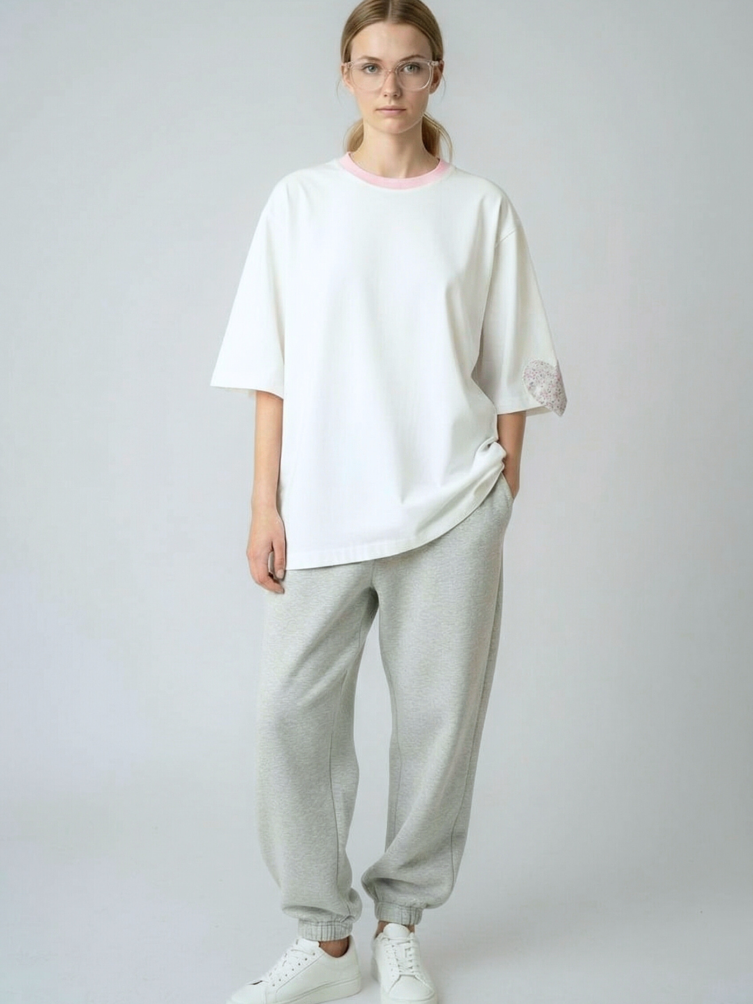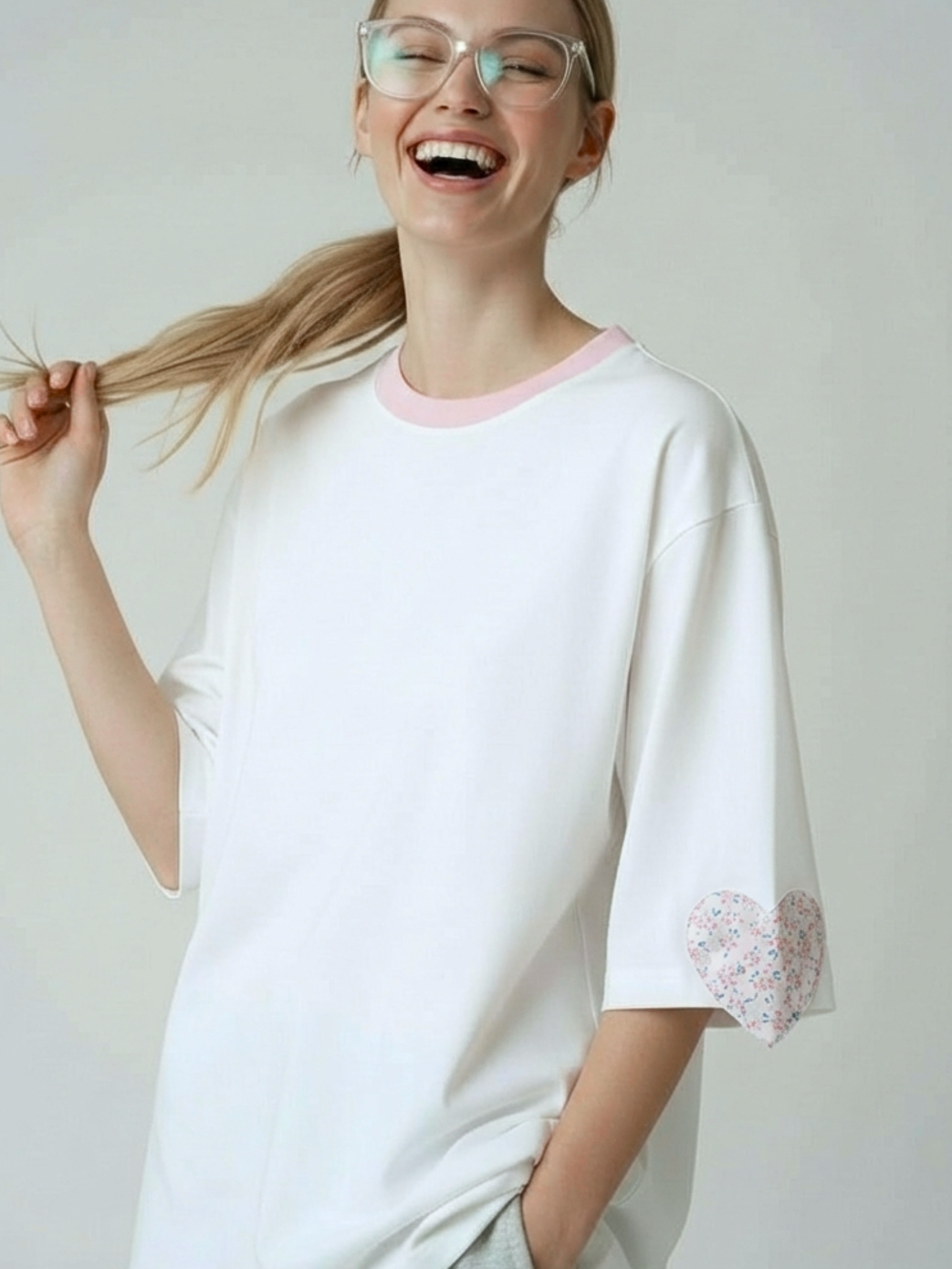 Стильная и невероятно удобная футболка оверсайз создана специально для будущих мам и женщин в период беременности и после родов. Свободный крой мягко садится по фигуре, не стесняет движений и комфортно подходит на любой срок беременности. Модель выполнена в базовом белом цвете с аккуратной контрастной горловиной и оригинальной декоративной нашивкой в форме сердечка на рукаве — нежная деталь, которая делает образ особенным и женственным. Футболка отлично сочетается с джинсами, леггинсами, шортами и юбками, подходит для прогулок, дома, поездок и повседневной носки. Идеальный вариант для тех, кто ценит комфорт и стиль.