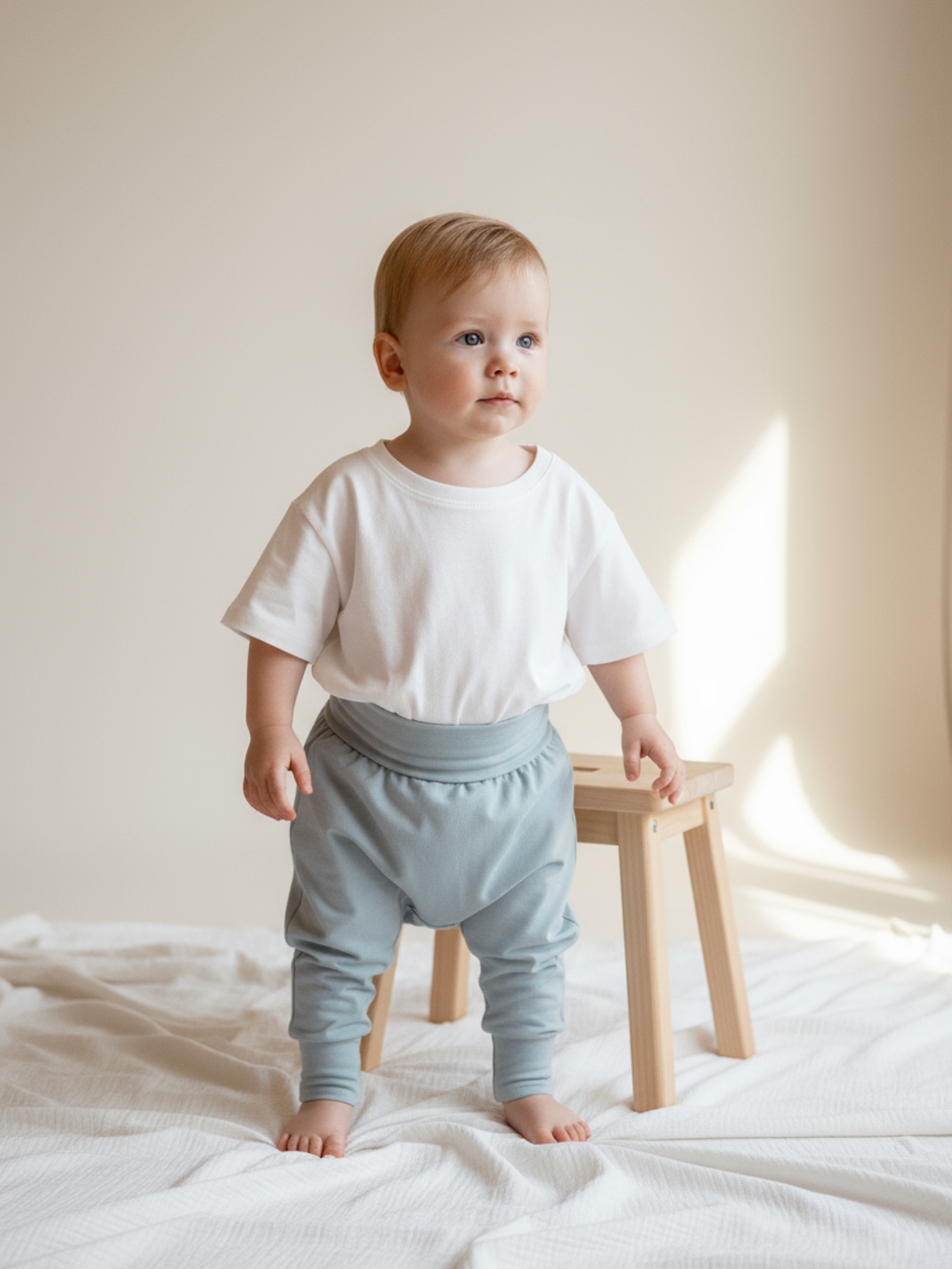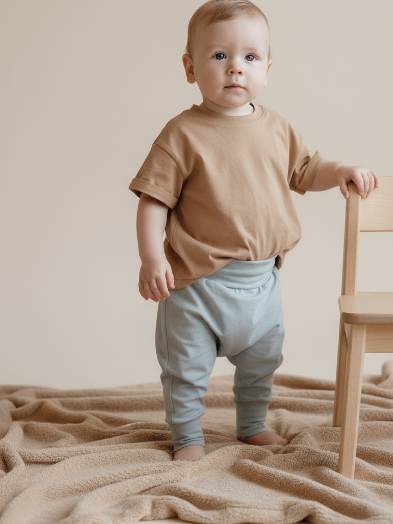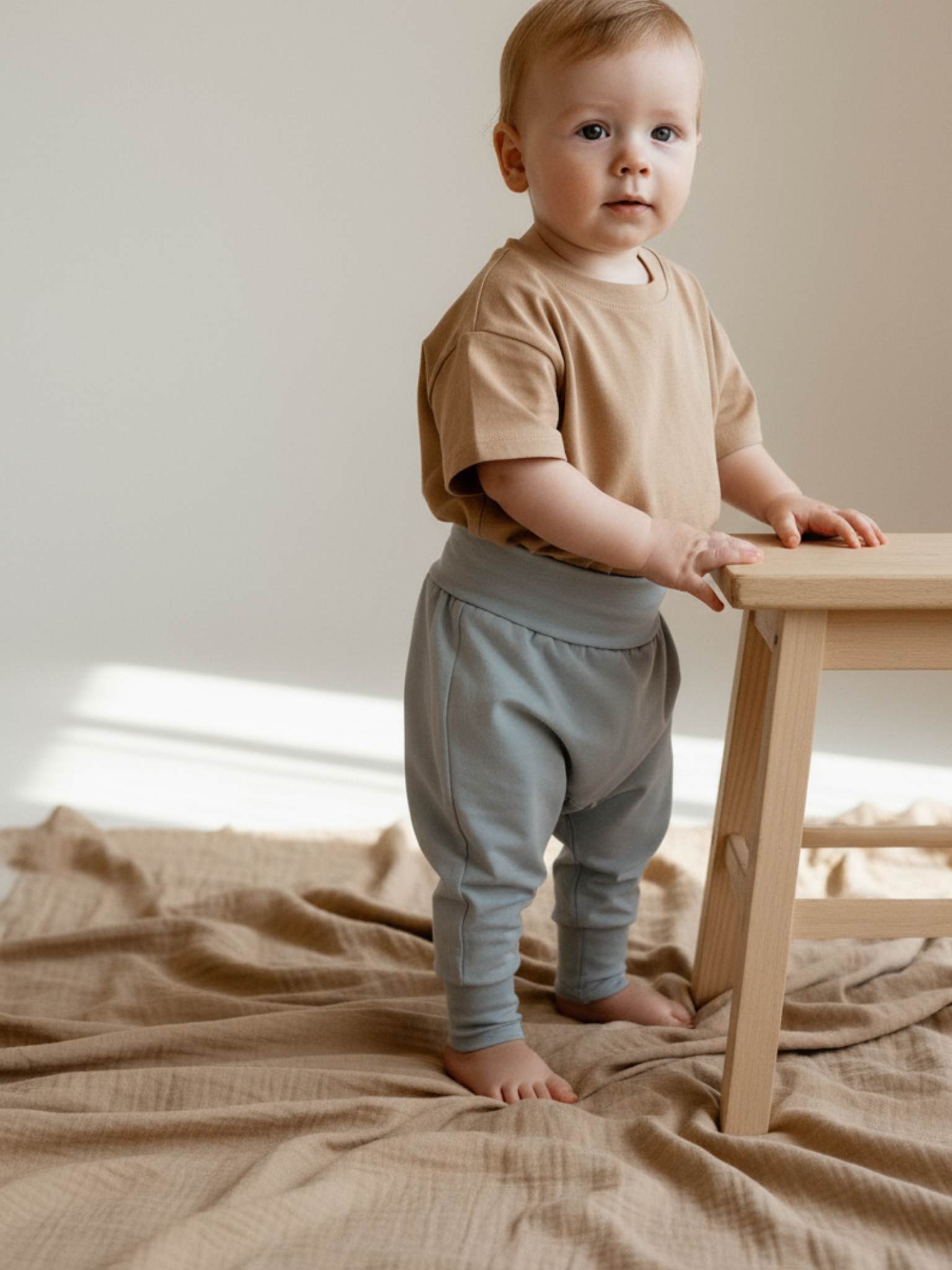Штанишки для малыша - выполнены из органического гипоаллергенного хлопка. Удлиненные манжеты и линия пояса позволят использовать ползунки во время активного роста малыша. Универсальные базовые цвета подходят для мальчиков и для девочек. Штанишки хорошо сочетаются как с нательными боди, так и с футболками и лонгсливами.